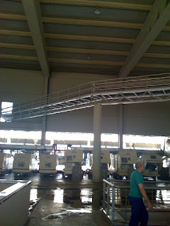 2. En cuanto esté libre, se cierra la plataforma indicada, el tractor entra en la nave y al recibir la señal de la encargada (he visto sólo chicas operando los robots), vuelca su remolque en la tolva.