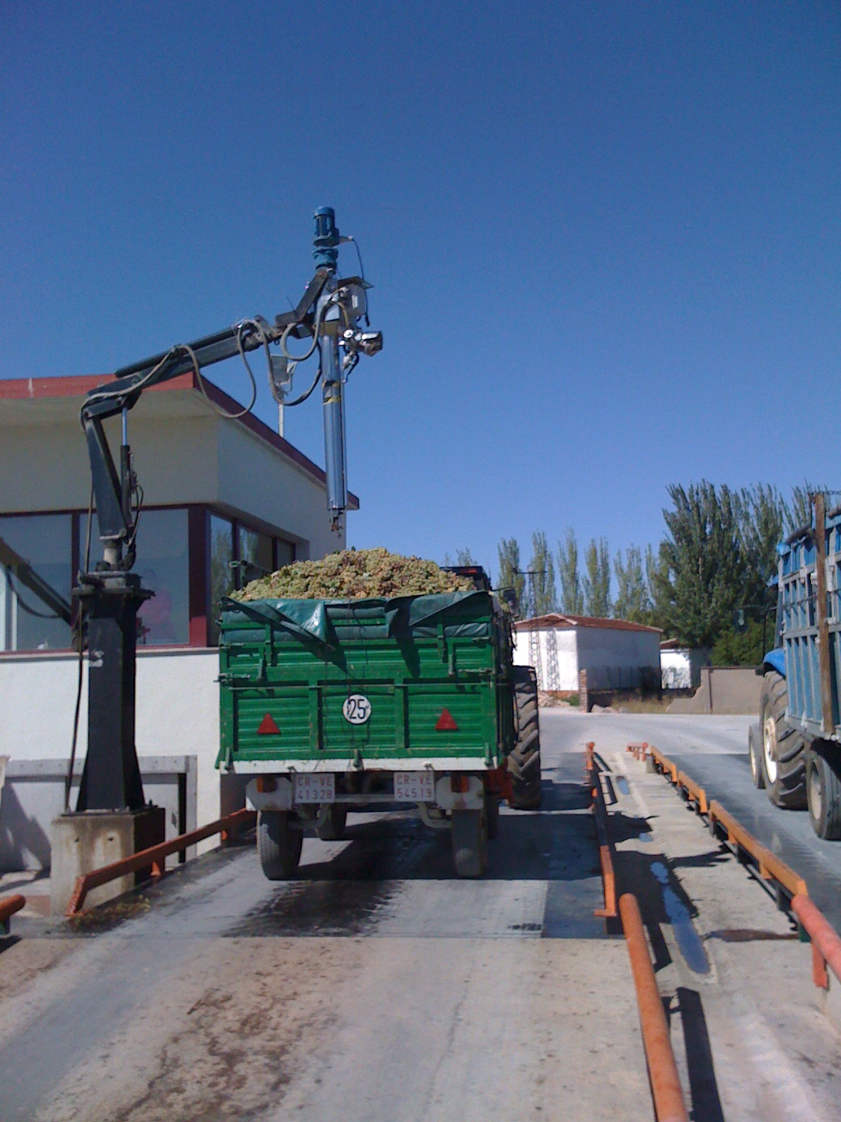 1. Cada remolque es pesado mientras con un «pincho» mecánico la encargada saca una muestra y calcula la gradación alcohólica de la uva.